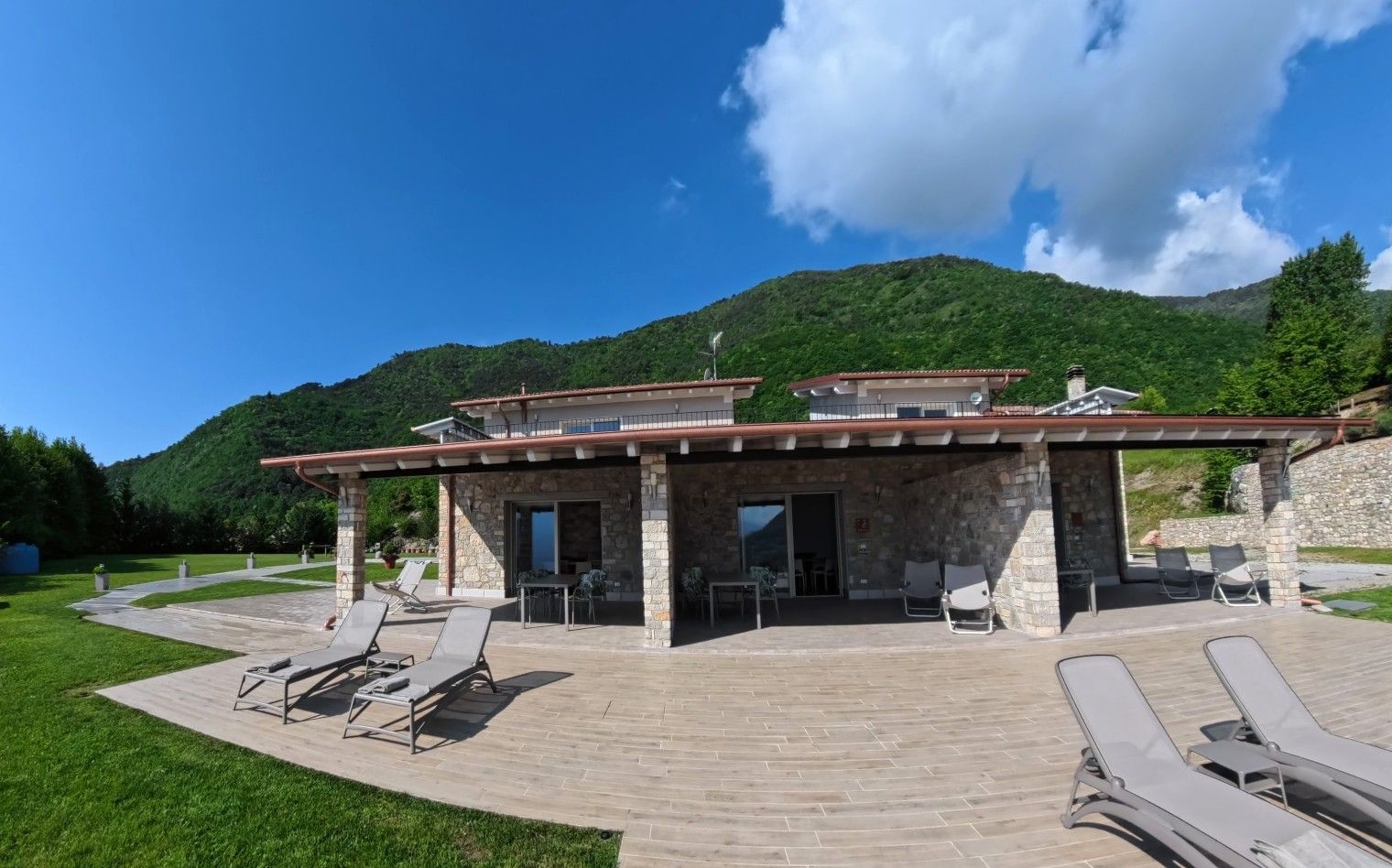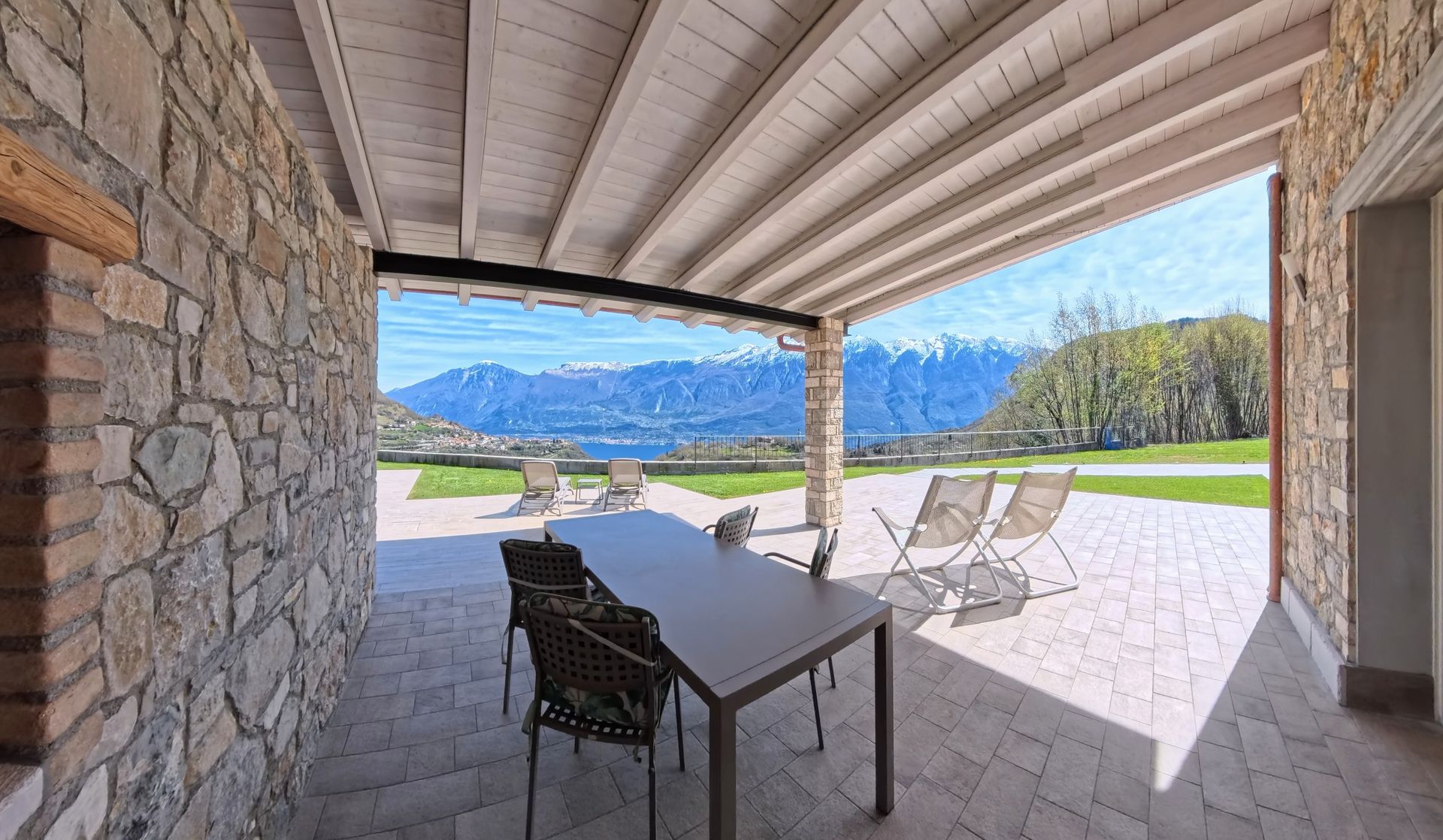 Große Terrasse mit Seeblick ausgestattet mit Tisch, Liegestühlen und Sonnenliegen