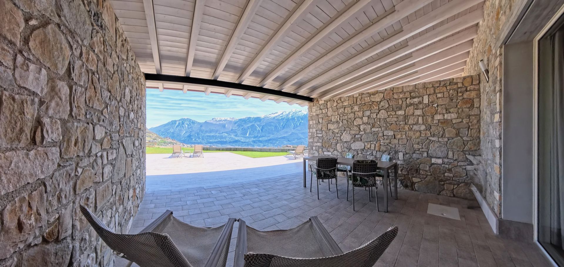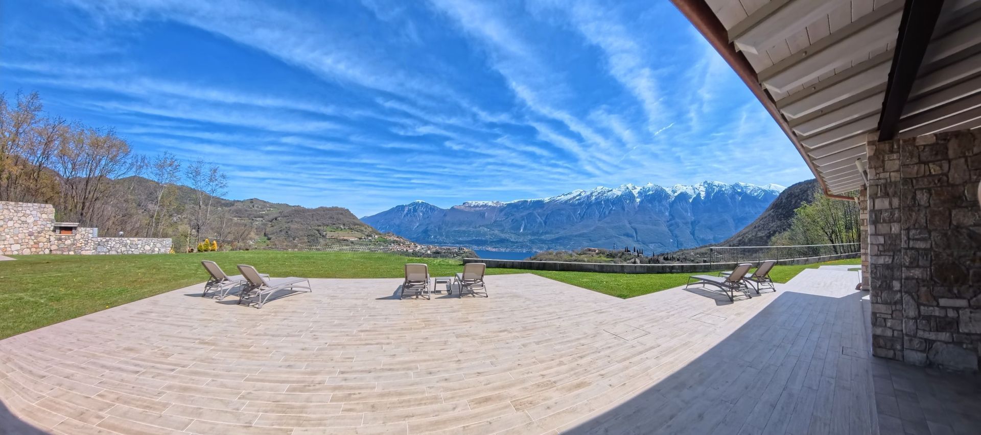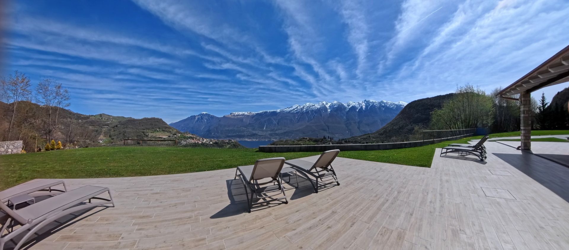 Große Terrasse mit Seeblick ausgestattet mit Tisch, Liegestühlen und Sonnenliegen