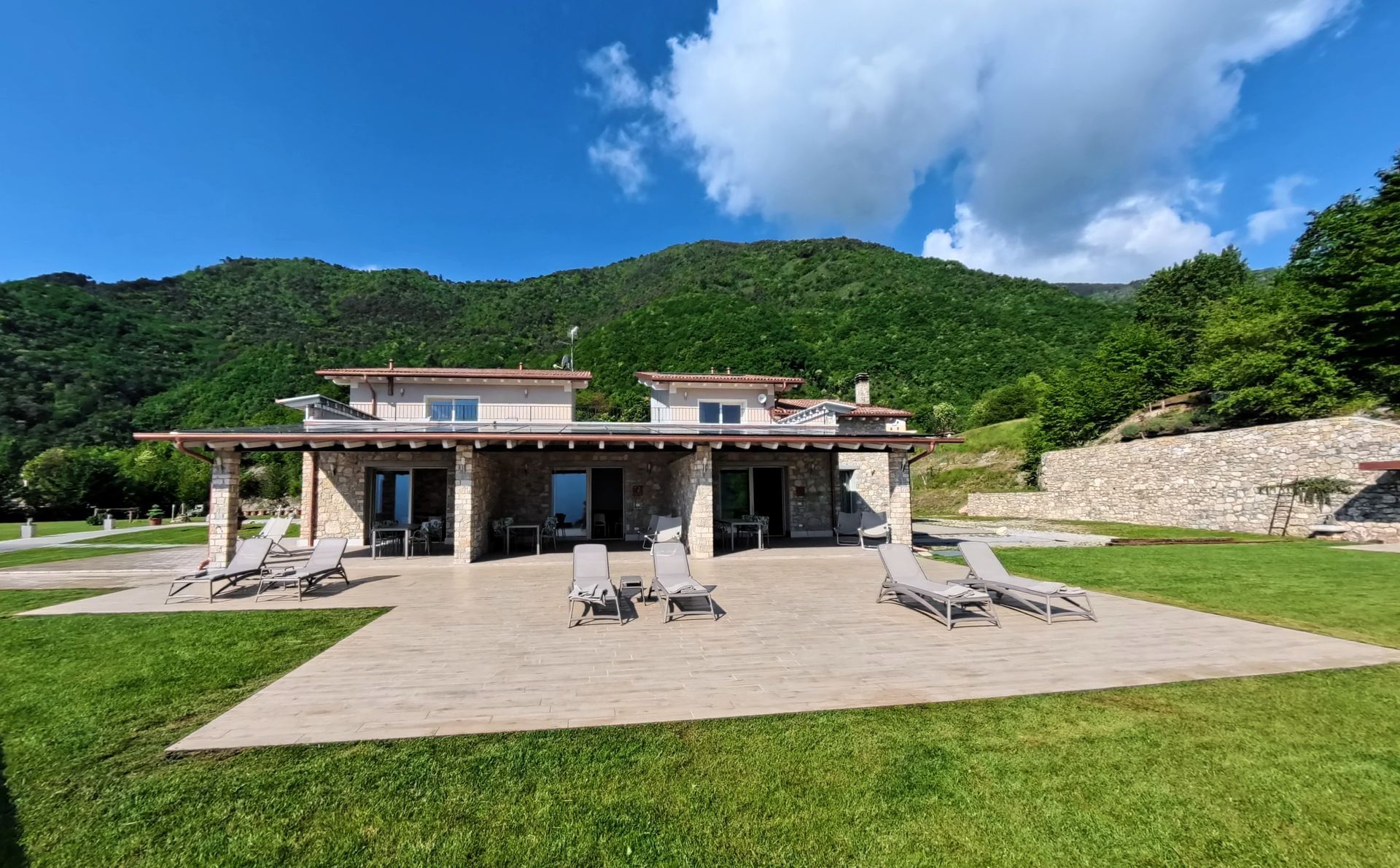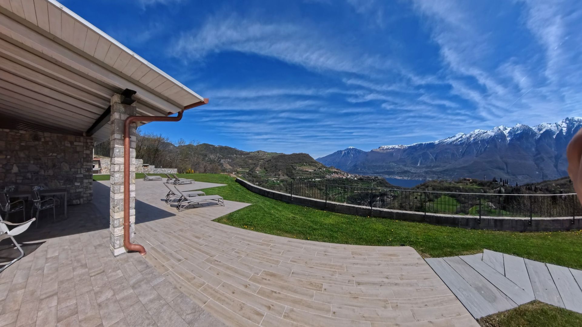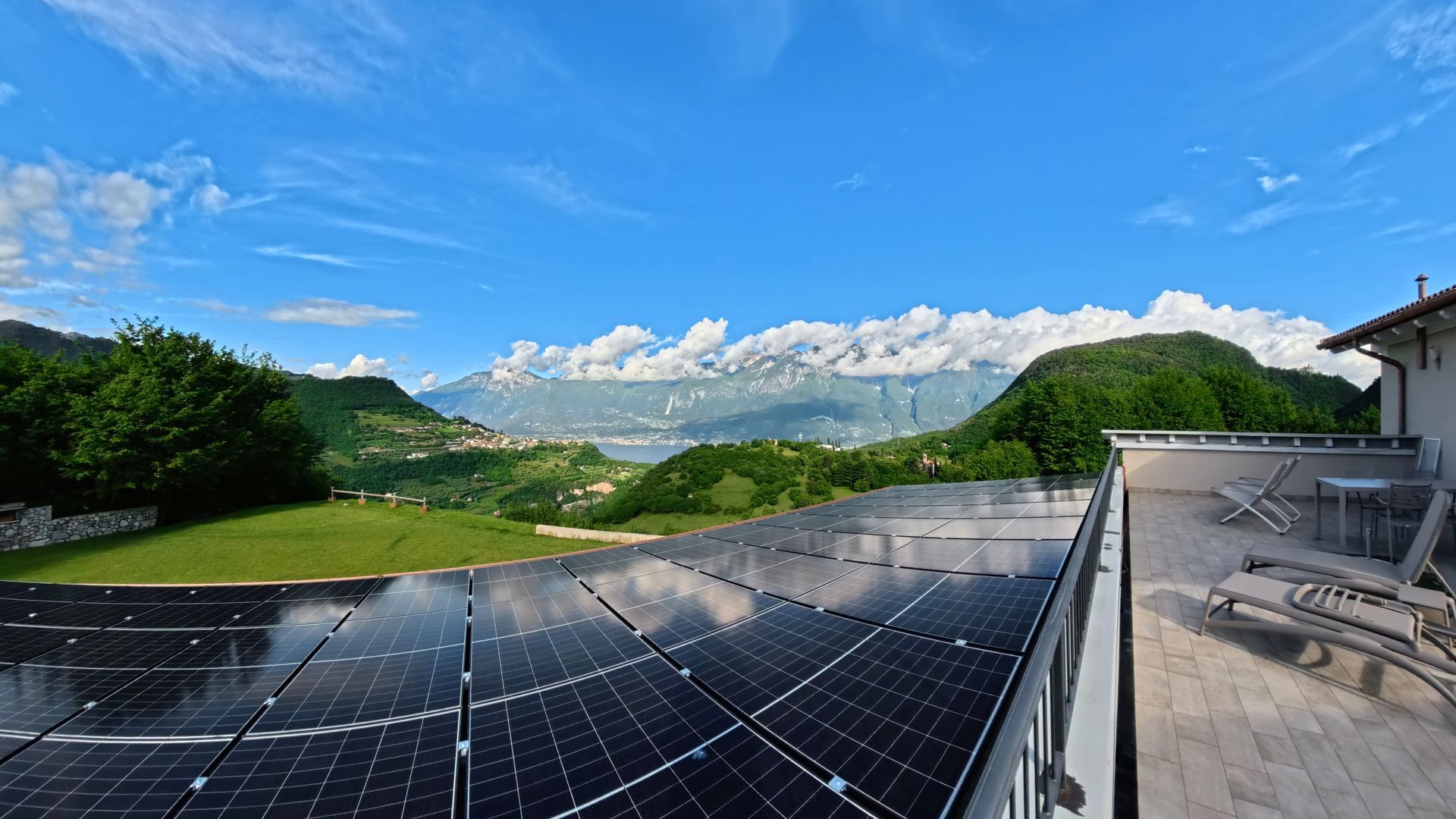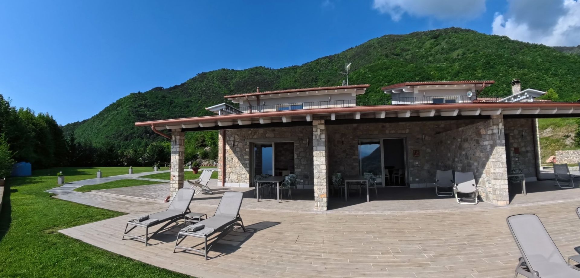 Große Terrasse mit Seeblick ausgestattet mit Tisch, Liegestühlen und Sonnenliegen