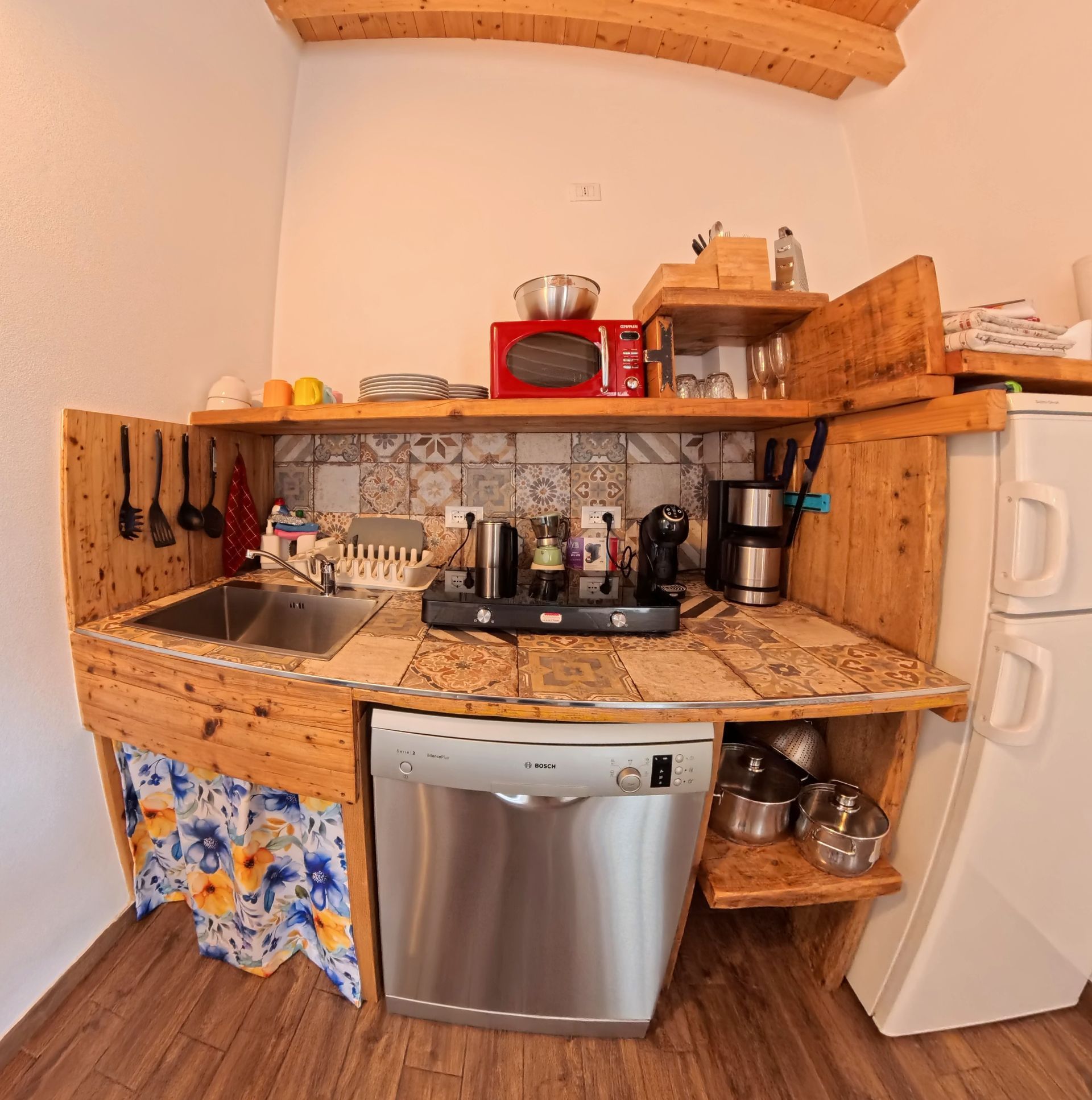 mit Induktionskochfeldern, Geschirrspüler, Melitta-Kaffeemaschine, Edelstahltöpfen, Kühlschrank